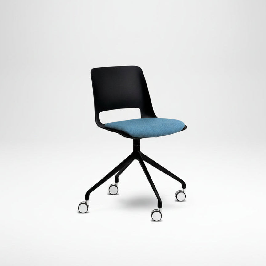 Meet your new office bestie – the Nu Soul Seat Pad chair on a customisable swivel base. This sleek number features a durable polypropylene shell in sophisticated black, paired with a custom fabric seat pad that's as comfy as it is stylish. The 4-way metal swivel base keeps you spinning through your workday with ease, while your choice of smooth-rolling castors or stationary glides means you can customize your roll. Whether you're tackling emails, brainstorming with colleagues, or just need to pivot your perspective, this chair delivers both form and function without the fuss.
