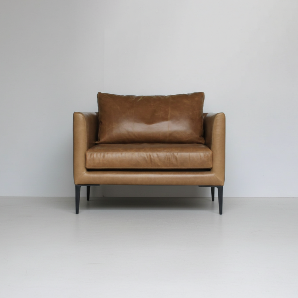 The Odyssey Armchair has been developed locally with the highest level of luxury and affordability in mind. Designed and made in Sydney NSW, the well structured timber frame is made from ethically farmed timbers and offers the expansion and contraction required in the Australian environment. No less than three grades of foam have been used in the upholstery and a zigzag spring seating system has been implemented for our design. Finish: Fully upholstered in fabric/leather, powdercoated metal legs - black. Note: House fabric/leather meterage will need to be added as a separate item to your cart for this product. Have a look at options available. Prices displayed here are for manufacture only. Lead time: 6-8 weeks Custom upholstery and finishes available on request.